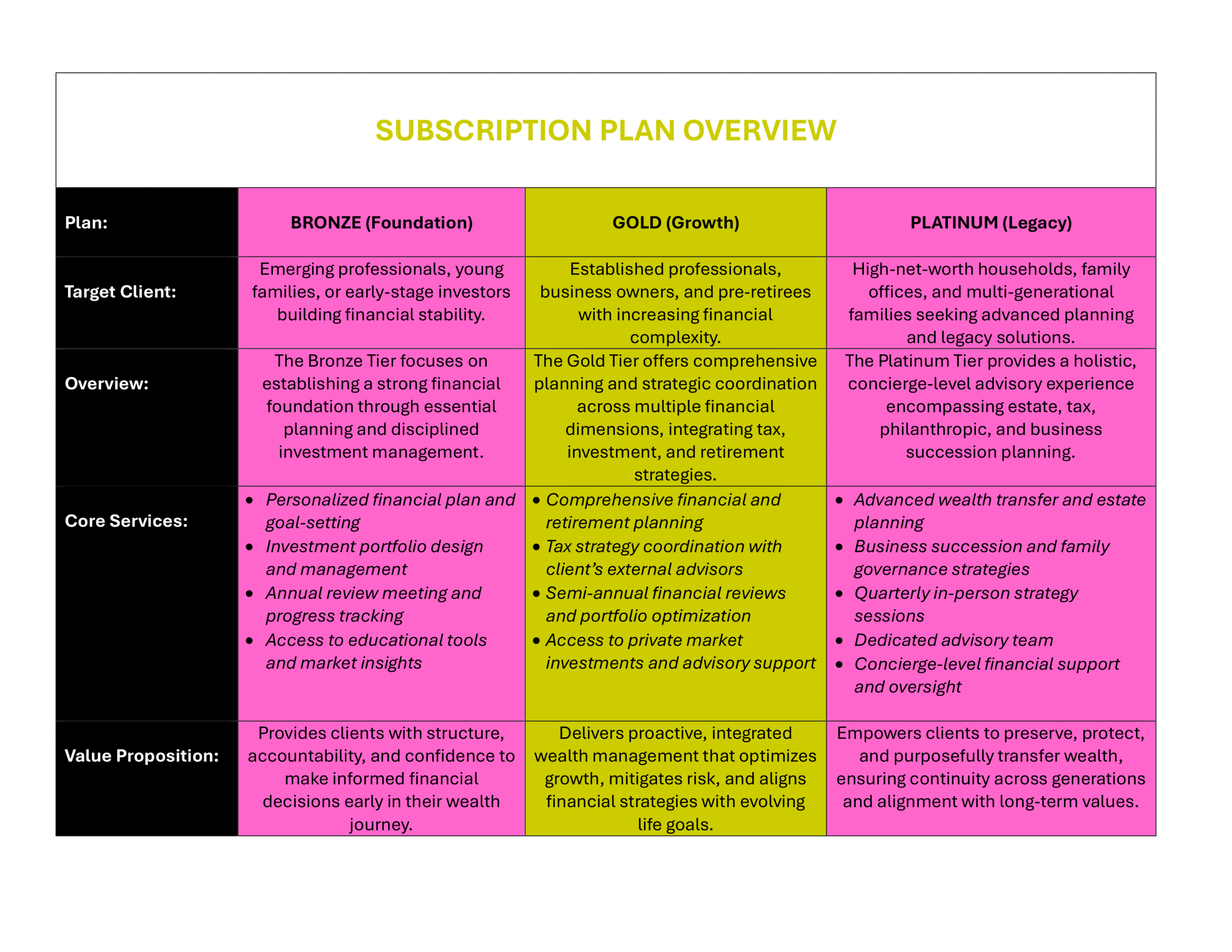 Under this model, clients subscribe to one of three defined service tiers — Bronze, Gold, or Platinum — each offering a progressively deeper level of financial planning, investment management, and strategic coordination. The structure emphasizes predictable pricing, clearly defined deliverables, and the flexibility for clients to adjust their service level as their needs evolve.